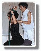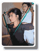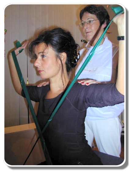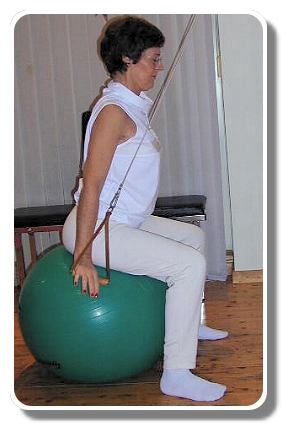 Wahrnehmung von falschen Bewegungsmustern, Einüben der gesunden Körperhaltung und Erlernen von ökonomischen Bewegungsabläufen. Auf den Fotos sehen Sie Übungen der Therapie nach BRÜGGER.