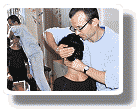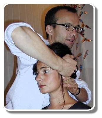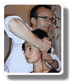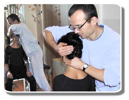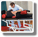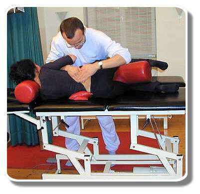 Behandlung von Bewegungs-Störungen der Funktionseinheit Gelenk-Muskel-Nerv durch Gelenkmobilisation, Dehnung verkürzter und Kräftigung geschwächter Muskeln. Oben sehen Sie manualtherapeutische Griffe bei Hals- und Lendenwirbelsäulen-Beschwerden.
