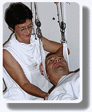 Behandlung mit Zugkraft auf Extremitäten oder Wirbelsäule zur Entlastung der Gelenke und Nerven. Abgebildet ist eine Traktions-Behandlung der Halswirbelsäule.
